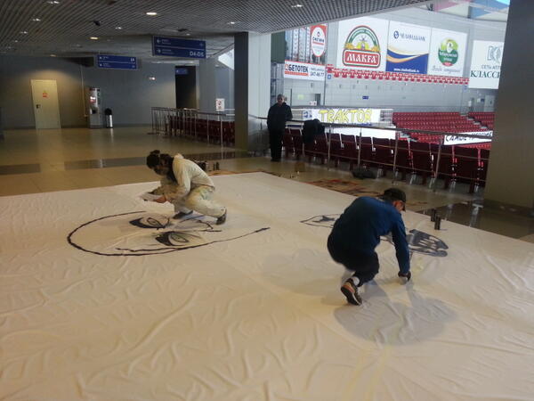 Болельщики «Трактора» рисуют огромный баннер в поддержку команды