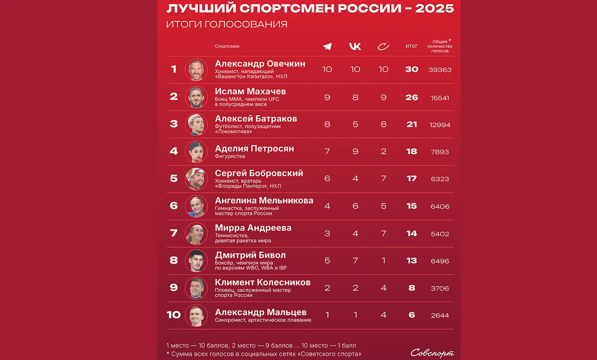 В топ-10 также вошли фигуристка Аделия Петросян, хоккеист Сергей Бобровский, гимнастка Ангелина Мельникова, теннисистка Мирра Андреева, боксёр Дмитрий Бивол, пловец Климент Колесников, синхронист Александр Мальцев.