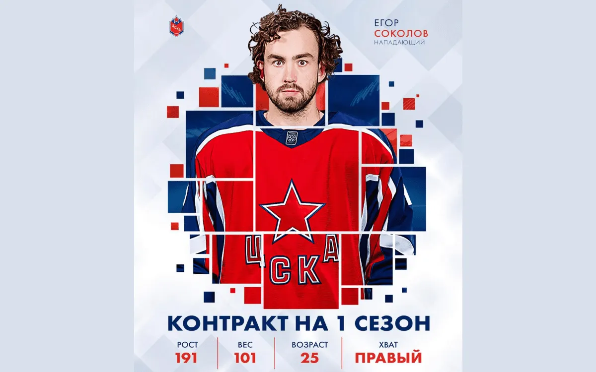 Пресс-служба ХК ЦСКА сообщила о подписании трудового соглашения с нападающим Егором Соколовым. Контракт с 25-летним форвардом рассчитан на один сезон.