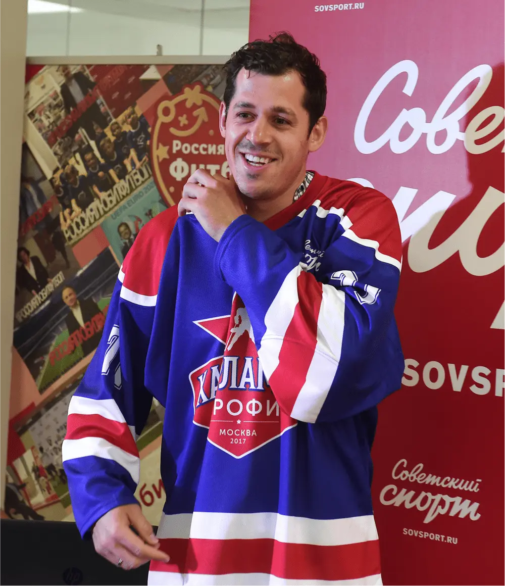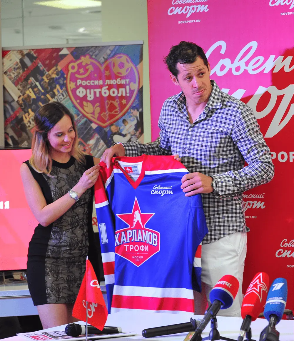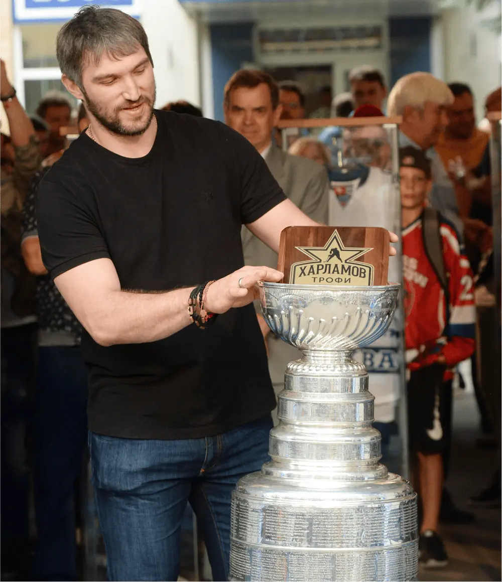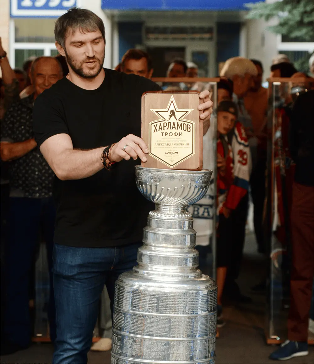 Капитан клуба «Вашингтон Кэпиталз» хоккеист Александр Овечкин демонстрирует Кубок Стэнли на территории СДЮШОР по хоккею «Динамо» имени А. И. Чернышёва в Москве.