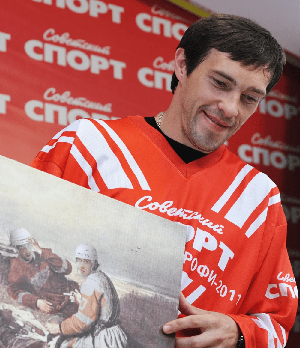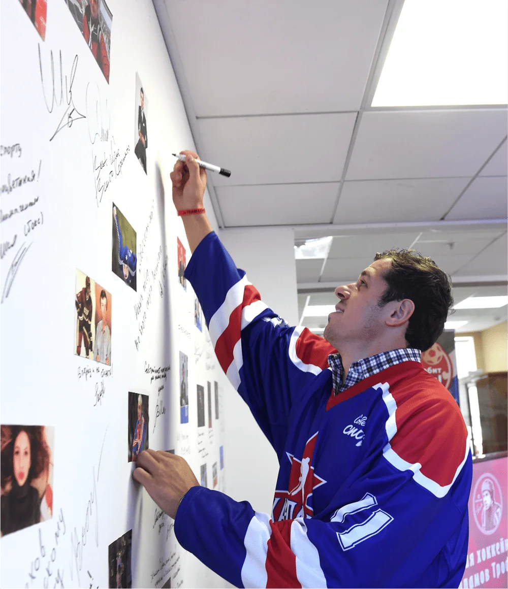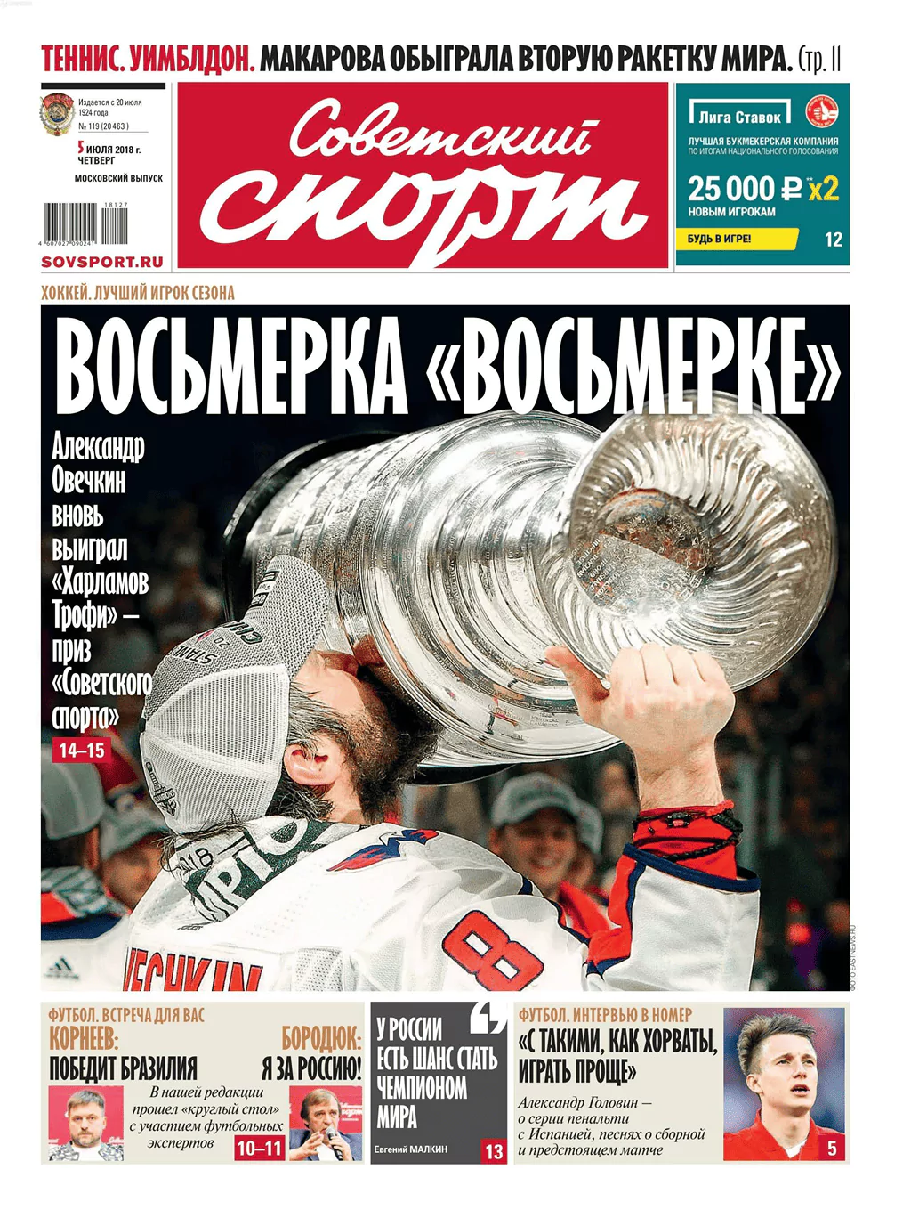 Капитан клуба «Вашингтон Кэпиталз» хоккеист Александр Овечкин демонстрирует Кубок Стэнли на территории СДЮШОР по хоккею «Динамо» имени А. И. Чернышёва в Москве.