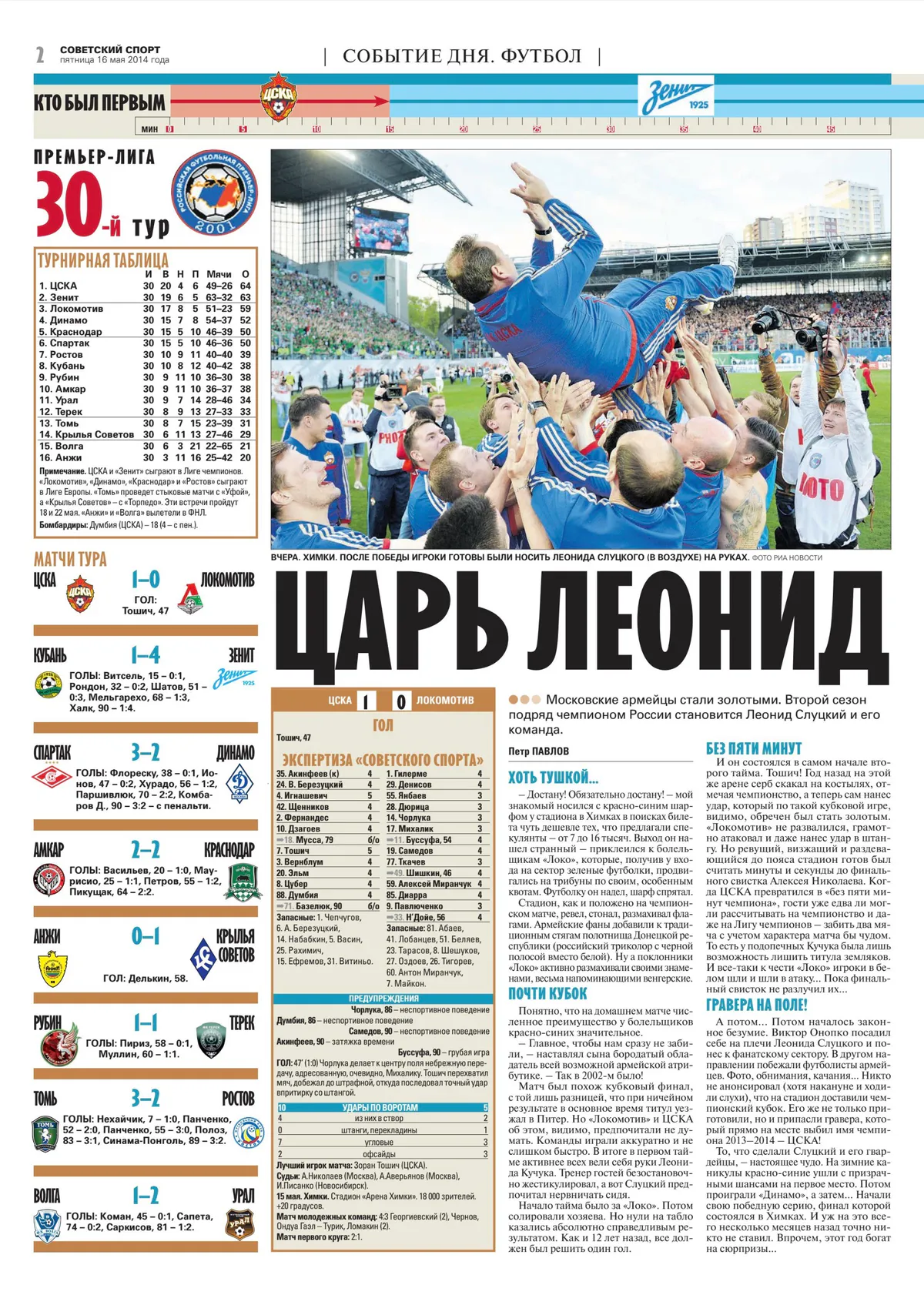 Поражение «Зенита» от «Динамо» означало лишь одно. На первое место выходил ЦСКА Леонида Слуцкого. К зимнему перерыву команда даже не была в тройке, эксперты прочили в чемпионы то «Локо», то «Зенит», то «Спартак». Но именно «армейцы» перед последним туром незаметно стали главным фаворитом. Их победная серия, начавшаяся в 21-й туре в той самой домашней встрече с питерцами, к тому моменту насчитывала уже девять игр.