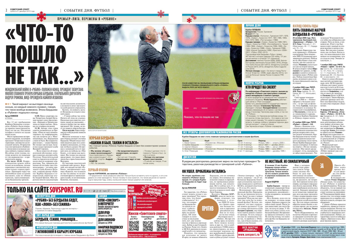 Экс-полузащитник «Рубина» Сергей Семак также выразил сожаление в связи с отставкой Бердыева. 25 декабря стало известно о том, что тренер, приведший казанцев к двум чемпионским титулам, взял паузу в работе до лета 2014 года, после чего мог сменить главного тренера киевского «Динамо» Олега Блохина, но планы не были осуществлены. «Рубин» же окончательно превратился в клуб-середняк.