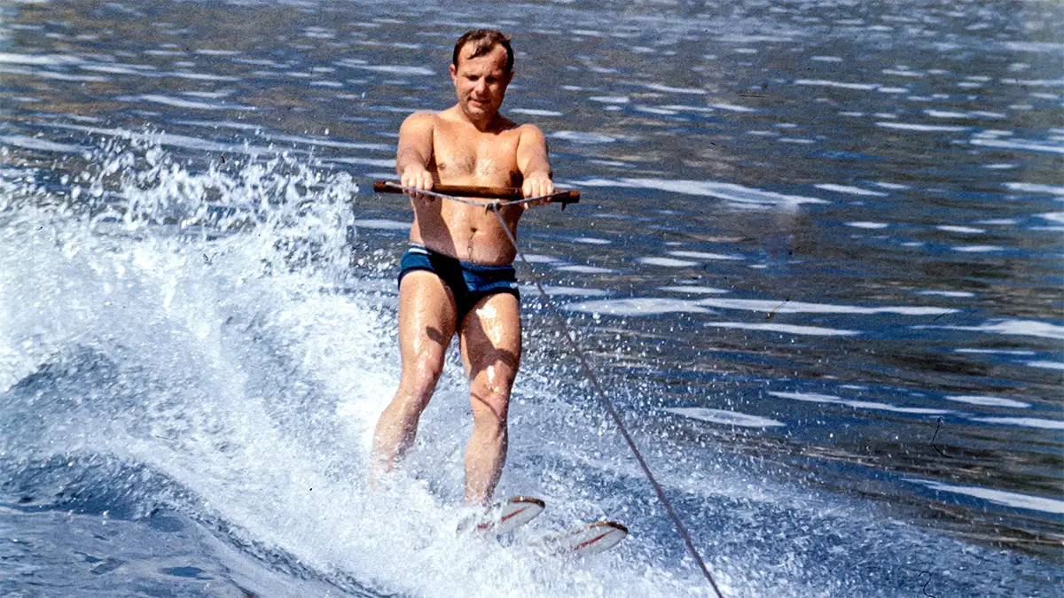 В 1957 году Гагарин ещё не знал, что полетит в космос. Как он сам признавался, даже и не мечтал об этом. Именно тогда уроженец Смоленской области впервые встал на лыжи на воде и помчал, разрезая волны и держась руками за канат от катера. Тогда это ещё не был никакой вид спорта — лишь обычное увлечение, с которым парня познакомили модные москвичи на пляже. И всё же водные лыжи действительно затянули Юрия Алексеевича. Он научился идеально балансировать на полной скорости. А когда вступил в отряд космонавтов, рассказал товарищам о модном занятии. Повёл всех на водохранилище и научил приёмам.