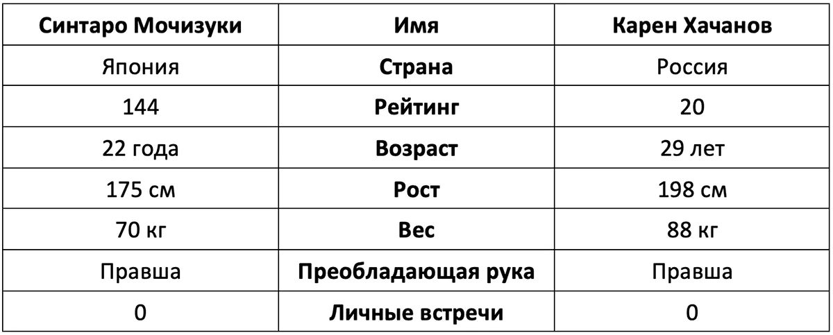 2 июля 2025 года состоялся матч второго круга Уимблдона-2025 между японцем Синтаро Мочизуки и россиянином Карена Хачанова. Встреча завершилась волевой победой представителя России по итогам пяти сетов. Теннисисты провели на корте 3 часа и 43 минуты. За матч Карен 10 раз подал навылет, допустил три двойные ошибки и реализовал 6 брейк-пойнтов из 16 заработанных. На счету Синтаро шесть эйсов, три двойные ошибки и 8 брейков из 20 брейк-поинтов.